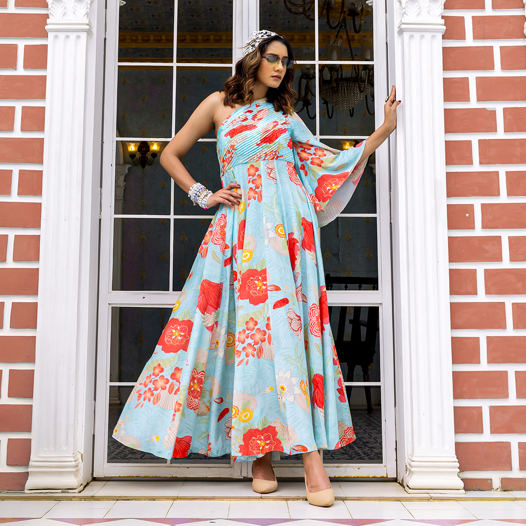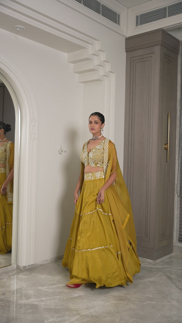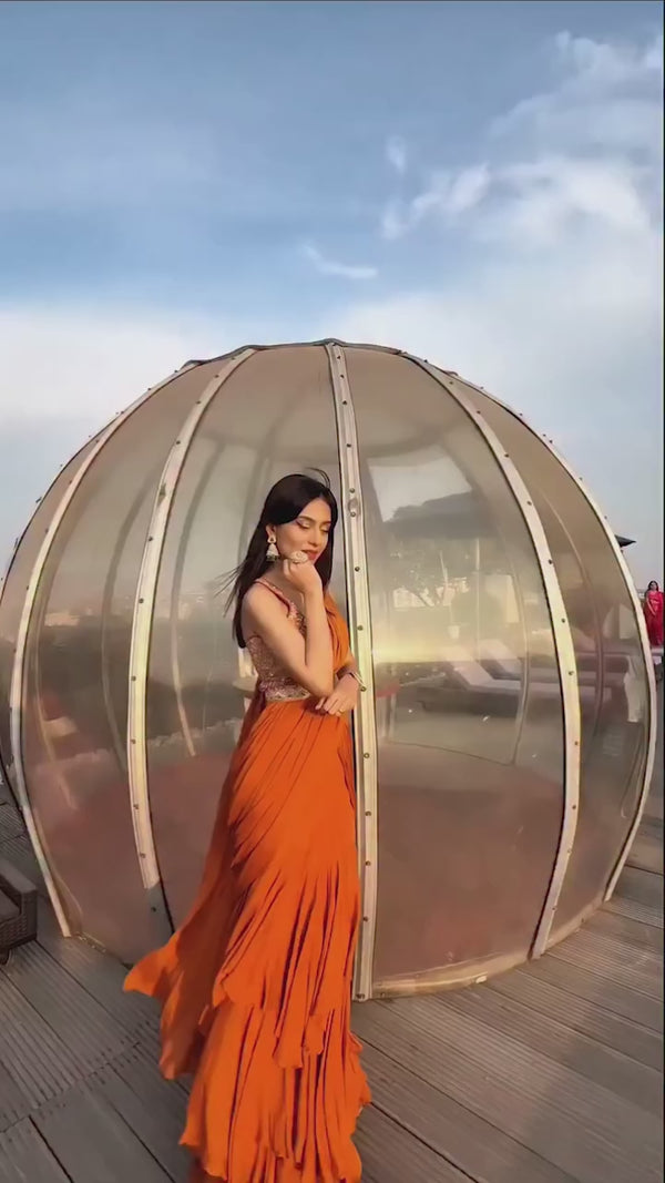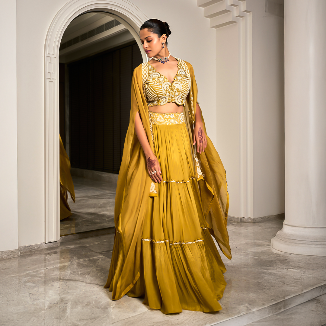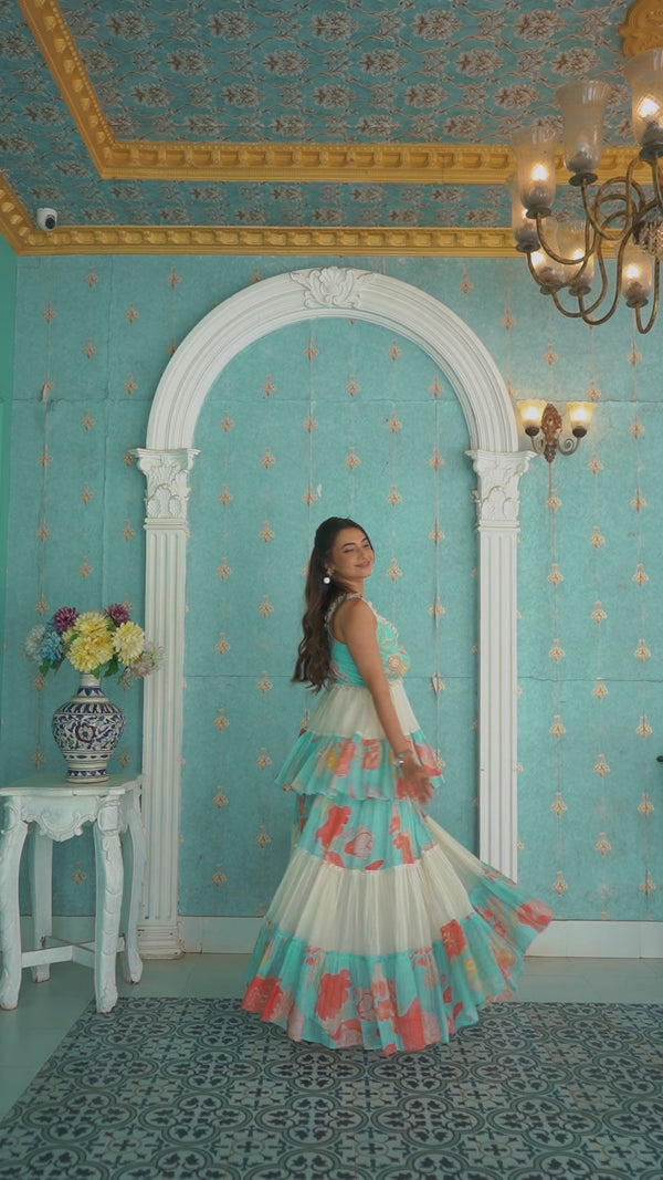 The soft pleats and layered frills give the outfit a lovely flow and volume, making it perfect for festive occasions or weddings. The embroidered waistband is a thoughtful touch.