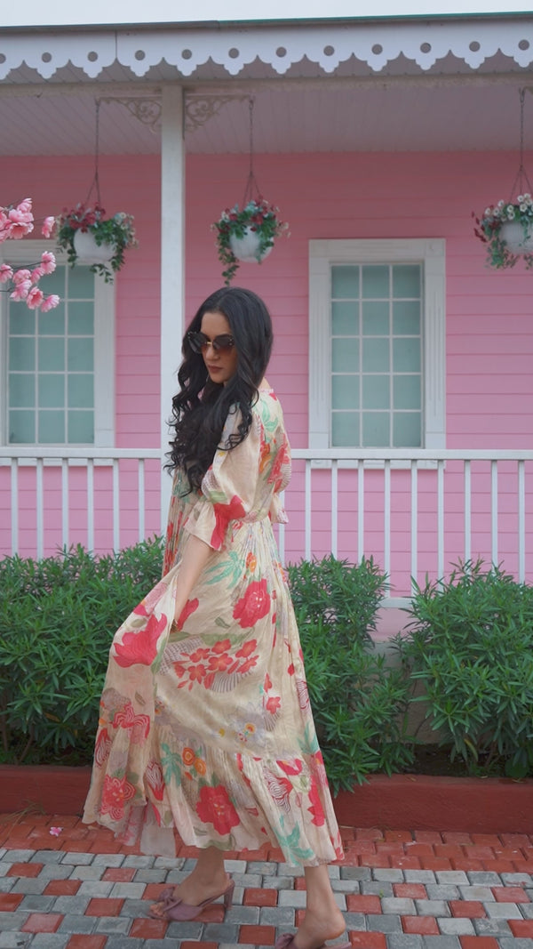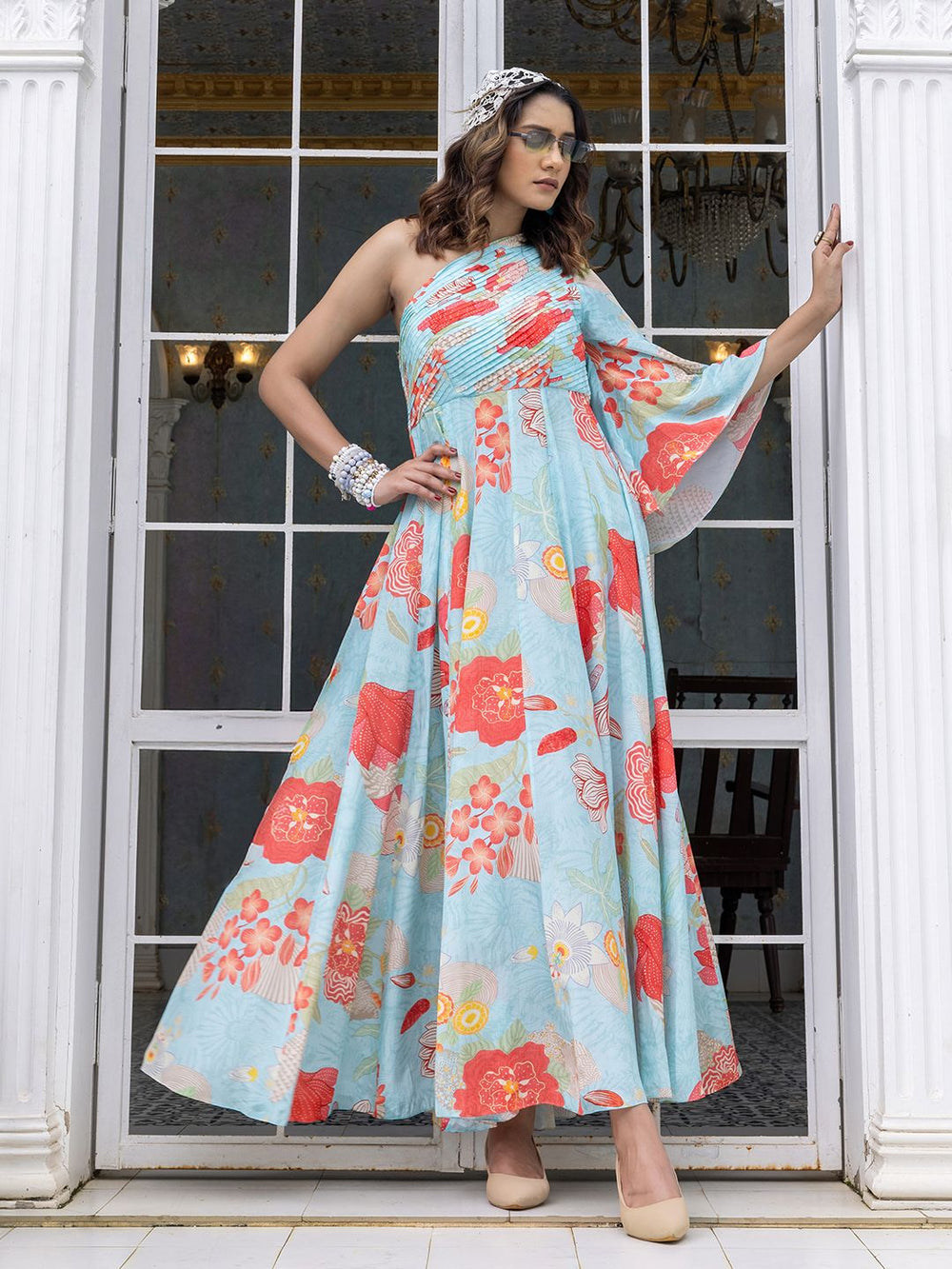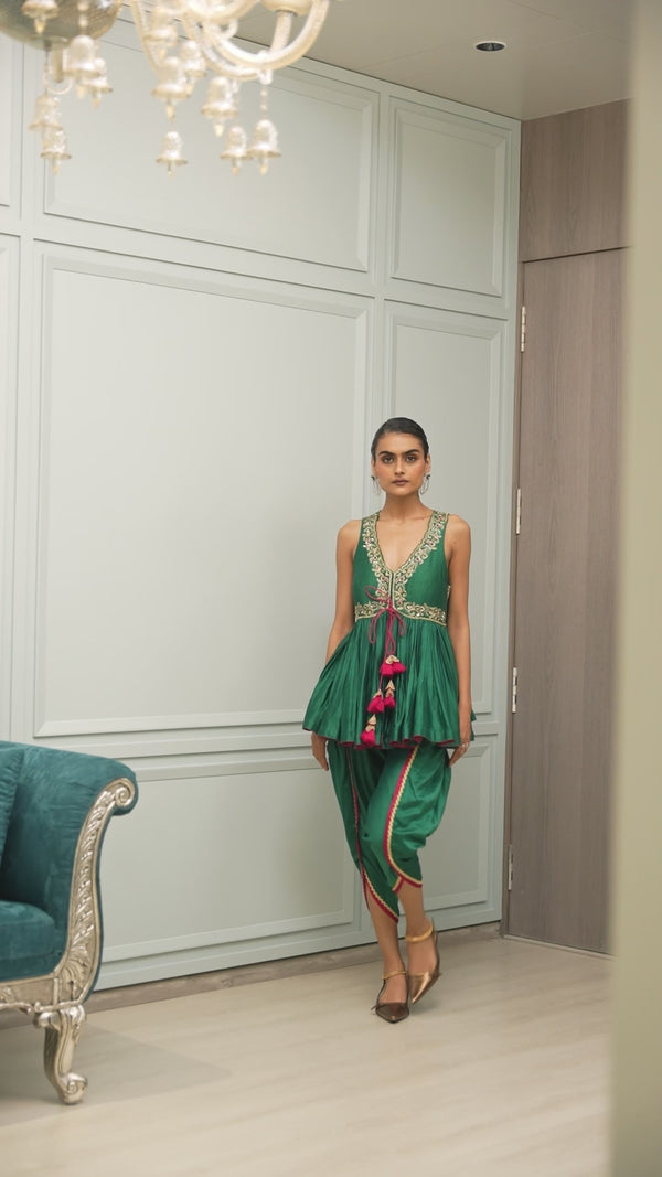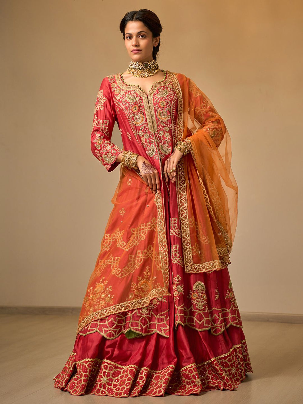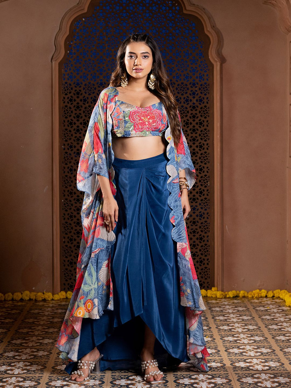 The soft pleats and layered frills give the outfit a lovely flow and volume, making it perfect for festive occasions or weddings. The embroidered waistband is a thoughtful touch.