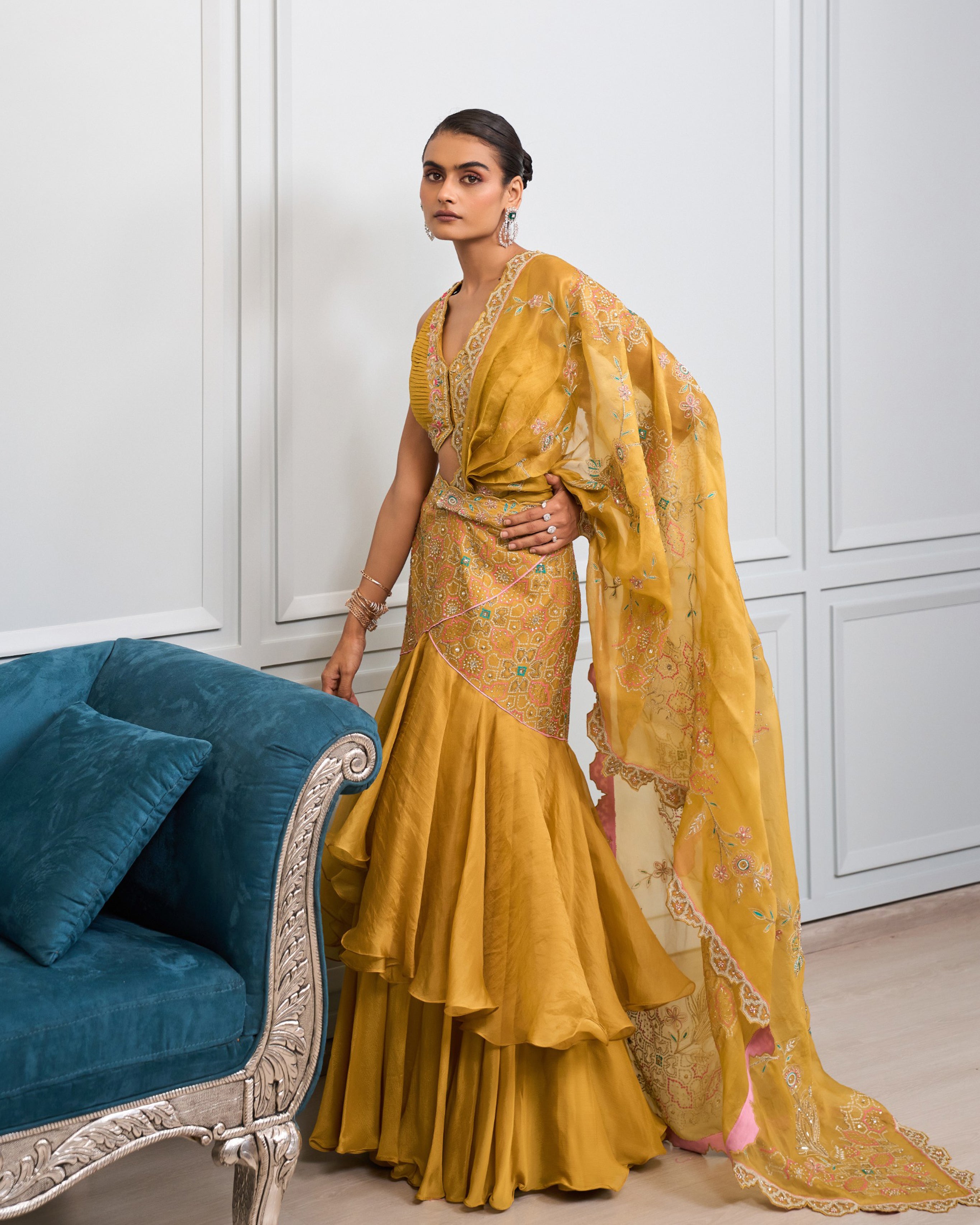 Add playful energy to your festive wardrobe with this marigold chiffon saree. Ruffled layers flow gracefully, while a zardozi-embroidered blouse adds richness to the airy drape. Sequins highlight the borders for extra sparkle. Perfect for evening parties filled with dance and celebration.
