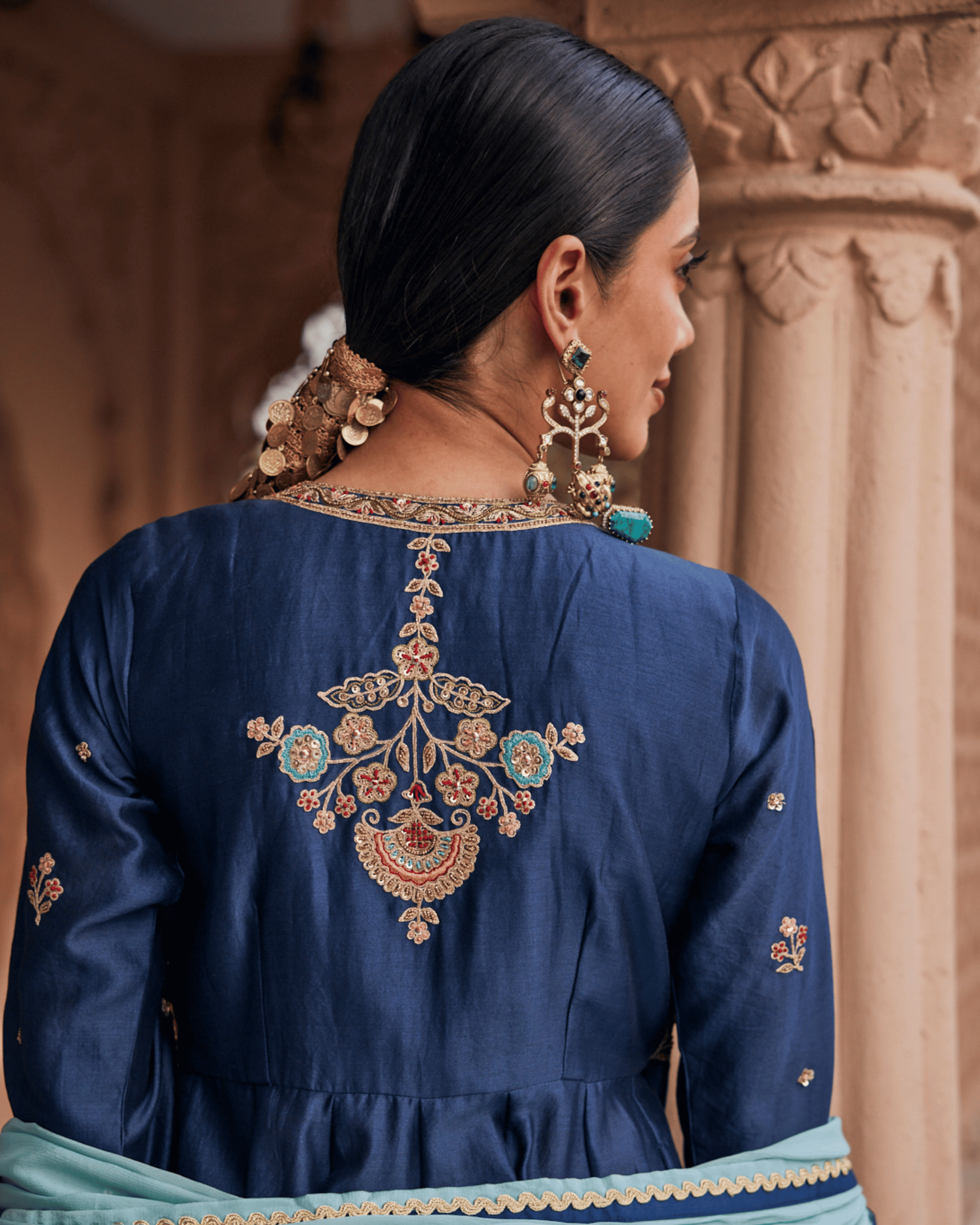 The "Emerald Blue Anarkali Set" by CREOLE feels calm, deep, and striking just like the night sky it’s inspired by. Crafted in chanderi silk, the Anarkali is fitted at the bust and waist, opening into a soft, easy flow with 3/4 sleeves and a V-neck. Dori work with sequins, poth, thread, and zardosi adds detail without taking over. Paired with fitted pants and a light chiffon dupatta, it’s effortless, polished, and easy to wear across occasions.