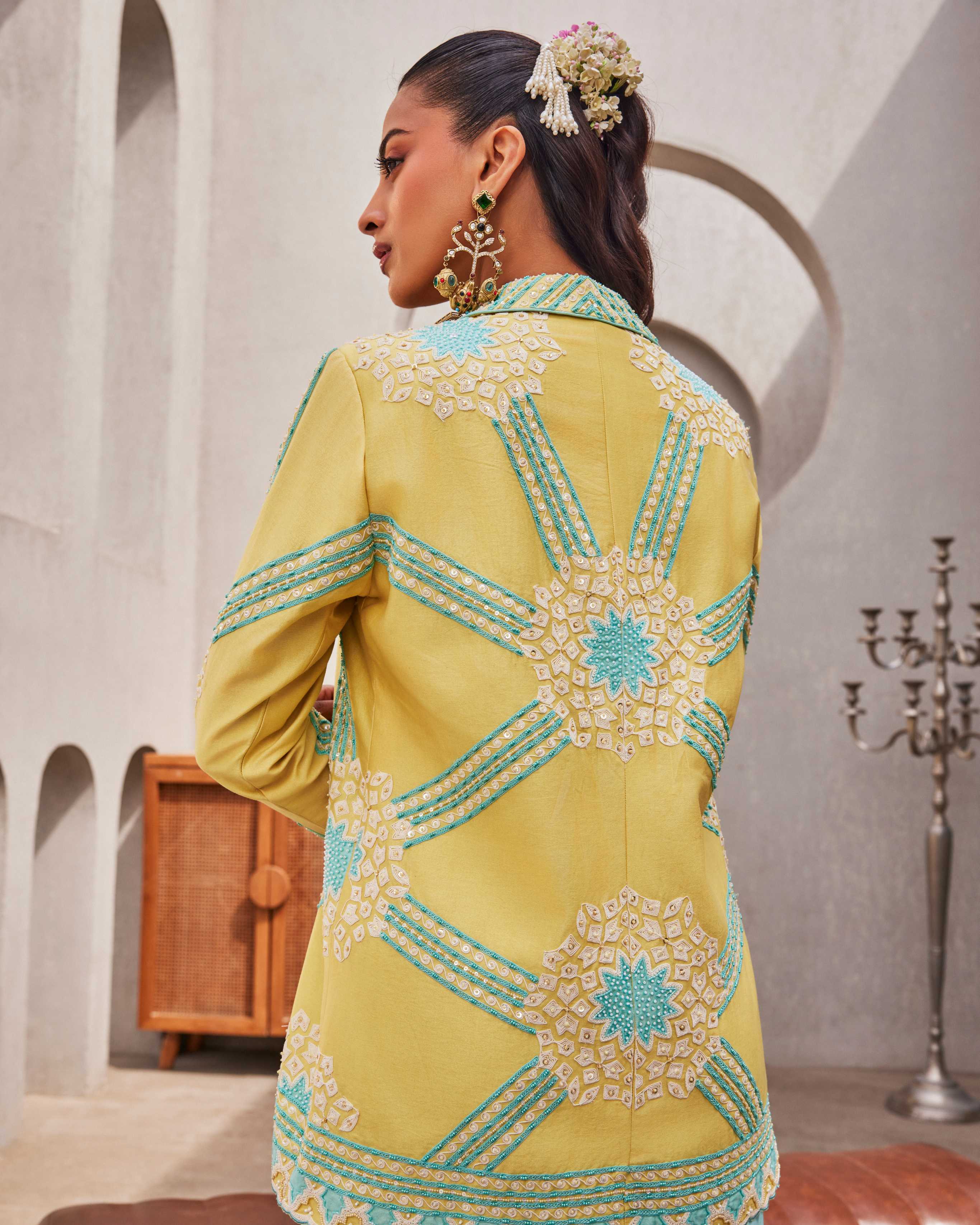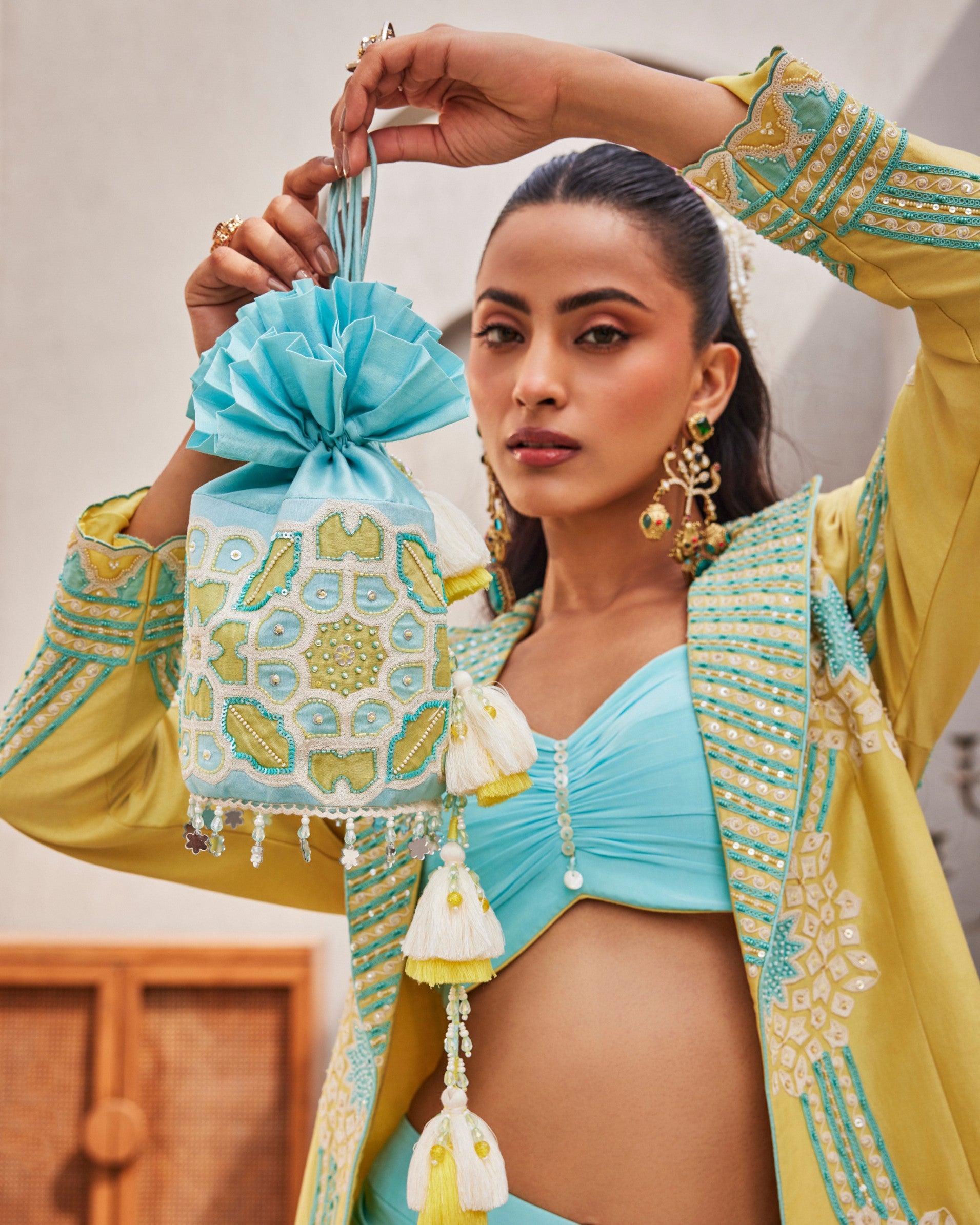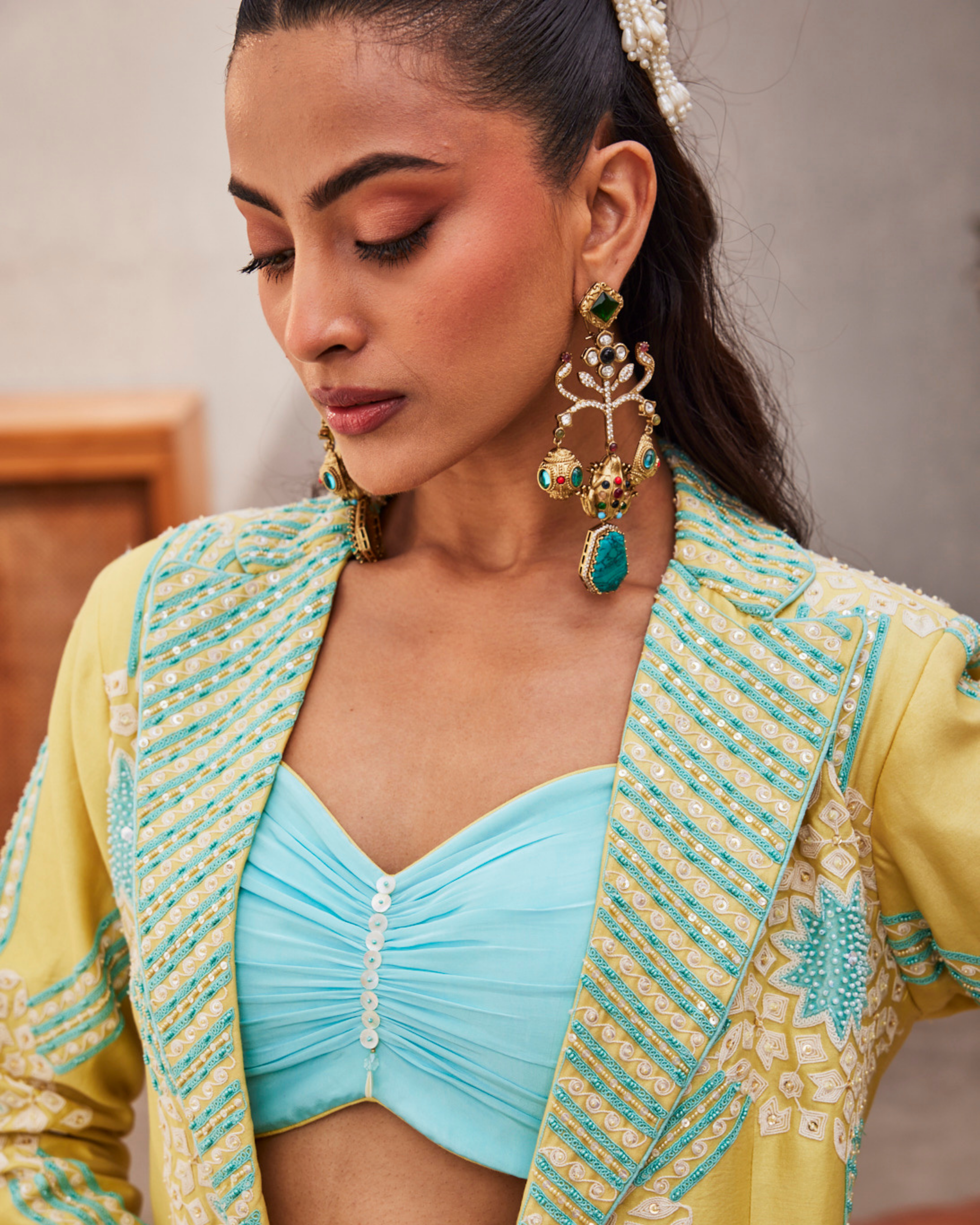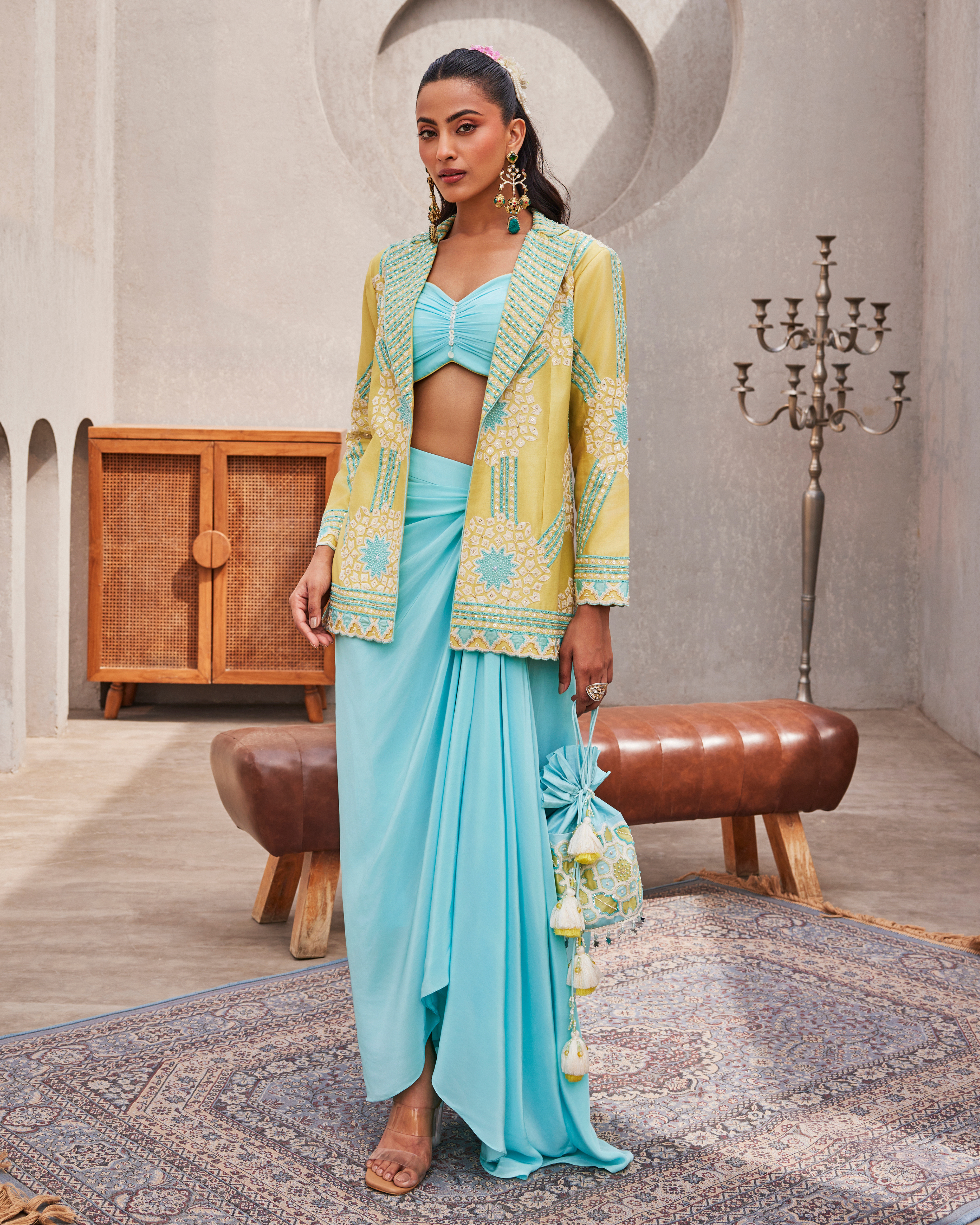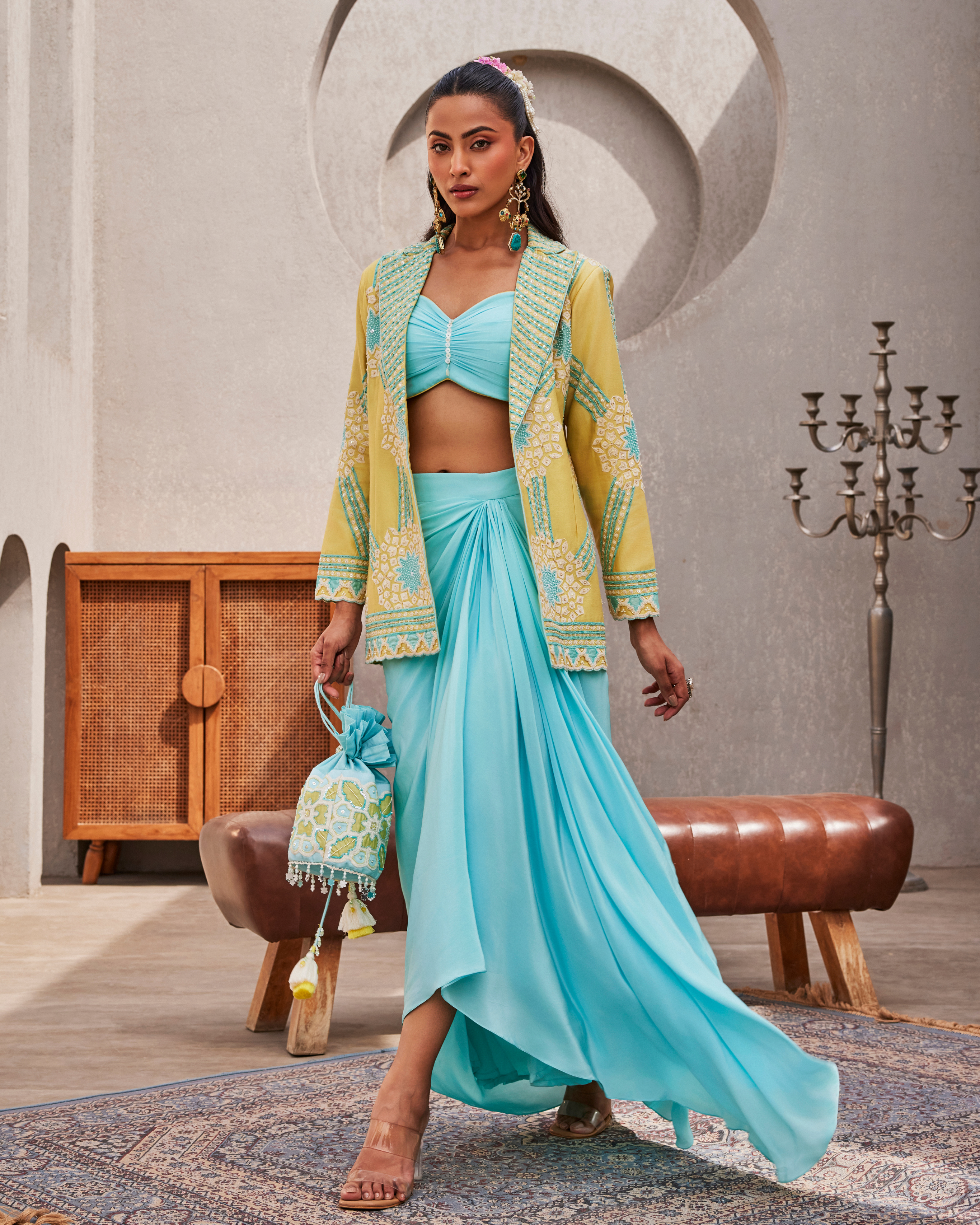 This custom made and handcrafted blue blazer, skirt, and bustier set by CREOLE brings together detail and ease in a way that feels natural. The chanderi silk blazer, cut in a relaxed fit, is layered with patchwork, dori work, sequins, cutdana, and poth, each element adding quiet texture. The natural crepe bustier, shaped at the bust and waist with a sweetheart neckline, pairs seamlessly with a skirt that sits clean at the waist. Designed for evenings and occasions where you want to feel put together without overdoing it.