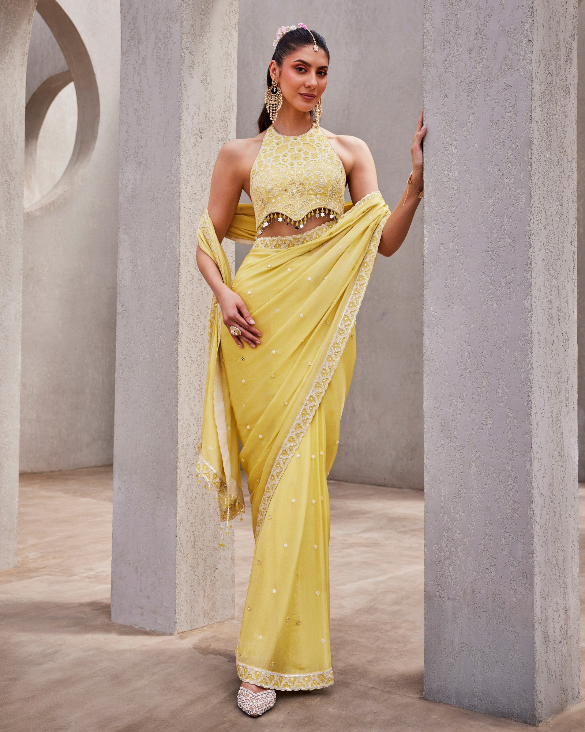 This Lime Cream Drape Saree by CREOLE carries a fresh, sunlit feel with just the right amount of detail. Crafted in satin chiffon, the drape sits clean at the waist, creating a soft, fluid fall. The organza satin blouse, fitted at the bust and waist with a high neck and no sleeves, is detailed with dori work, sequins, poth, mirror, and cutdana, finished with statement crystal tassels bringing brightness and edge to the look