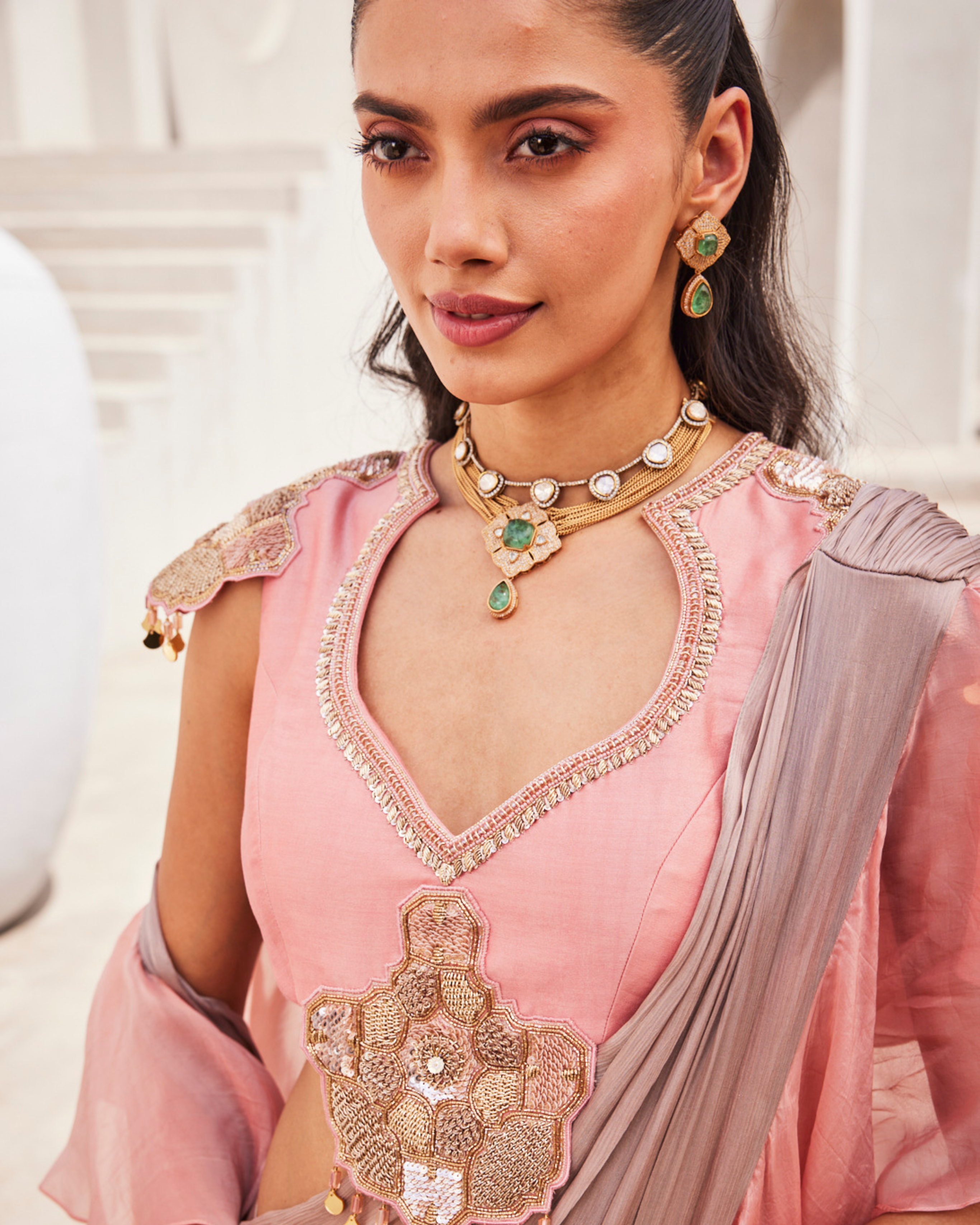 Our Pearl grey saree brings back a sense of timeless dressing with a softer, modern ease. The satin chiffon and organza satin drape falls fluidly, sitting clean at the waist. Paired with a chanderi silk blouse featuring a betel leaf neckline and cape sleeves, it carries detailed handwork—cutwork, sequins, cutdana, poth, naksi, sadi, mirror, and zardosi adding depth while keeping the overall feel effortless.