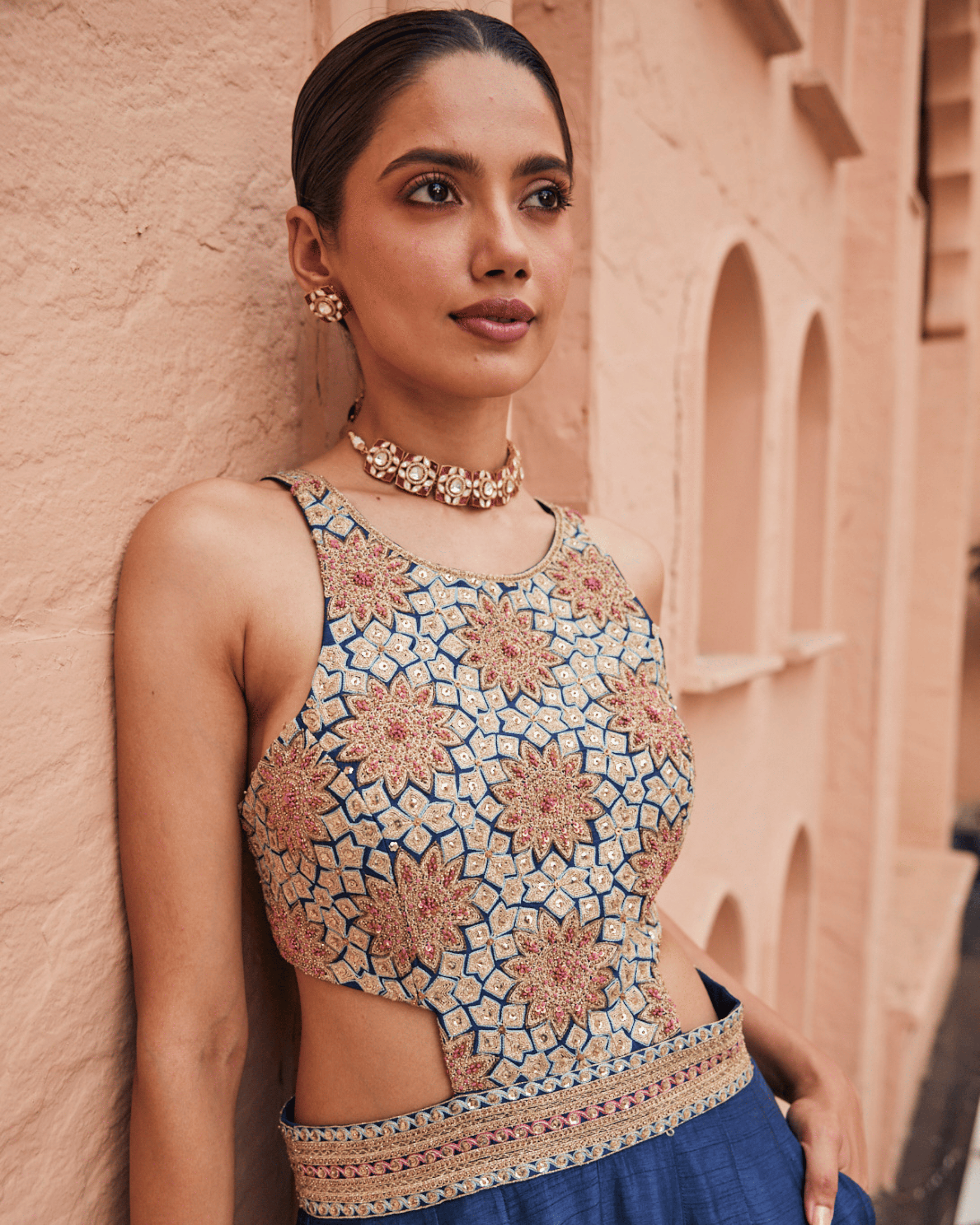 The "Royal Jade Navy Jumpsuit" by CREOLE is made for nights that turn into stories. Crafted in rich raw silk and fitted just right at the bust and waist, it features a sharp high neck and a sleeveless cut that keeps it clean and modern. Detailed with dori, mirror, sequins, cutdana, poth, French knots, and zardosi, it brings just the right amount of shine, easy to wear, hard to miss.