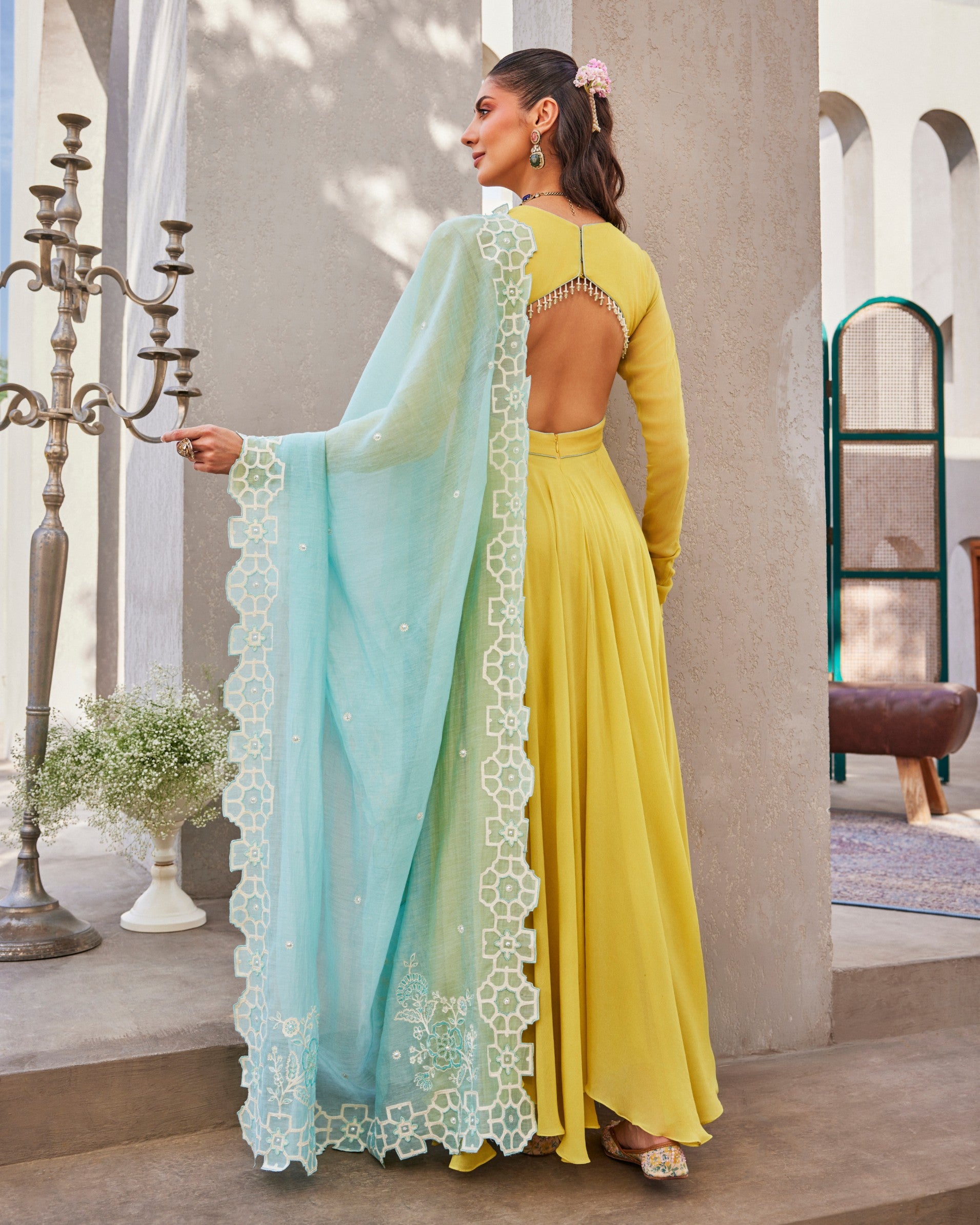 Sunlit in lime yellow, this georgette Anarkali feels like a fresh summer morning, breathable, and effortlessly flowy. Fitted at the bust and waist, it opens into an easy silhouette with full sleeves and a flattering V-neck. Paired with an organza satin dupatta, it’s perfect for day festivities, brunches, and warm evening celebrations.