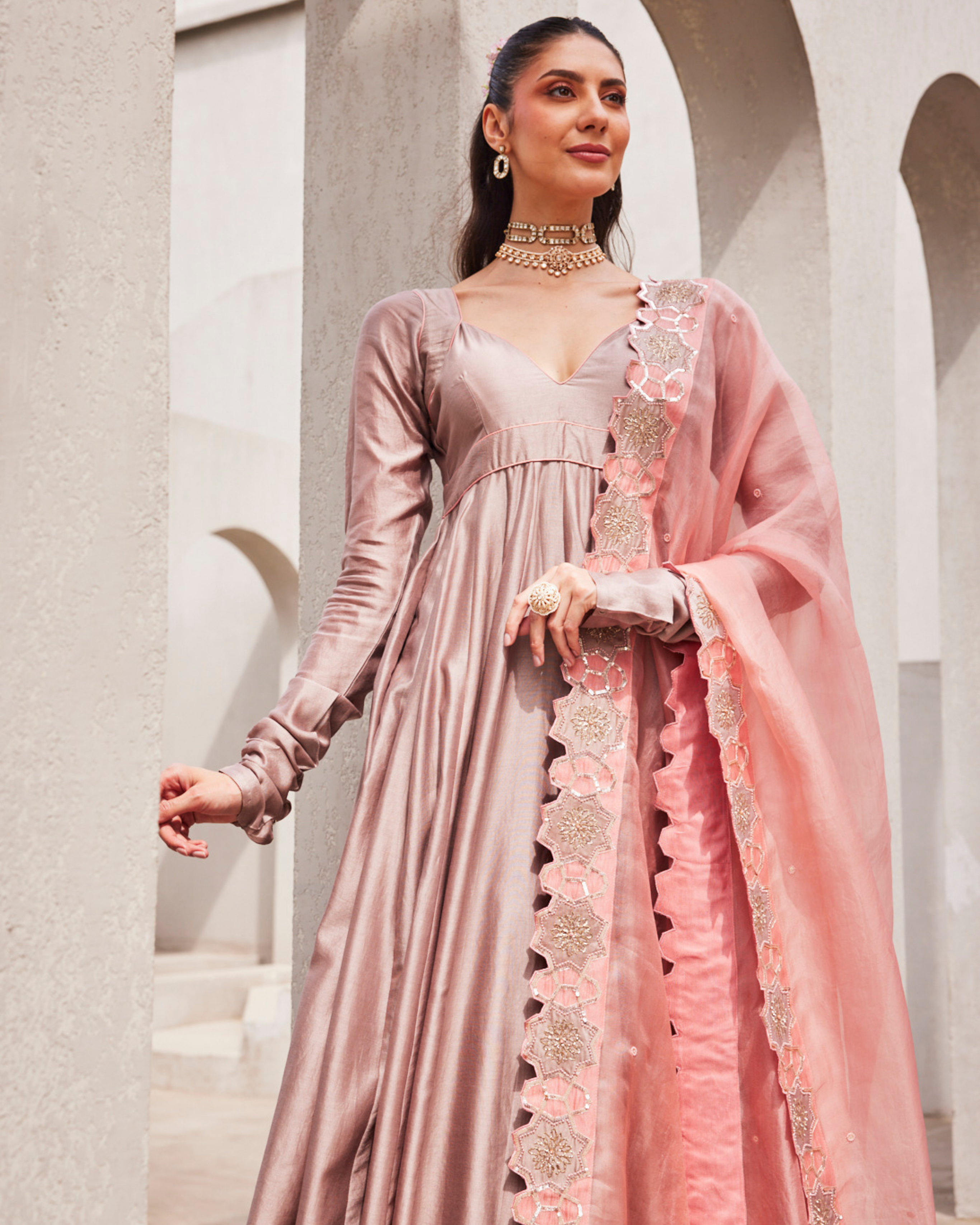This gorgeous grey Anarkali set, crafted in chanderi silk, features a clean, fitted silhouette at the bust and waist. The sweetheart neckline and Full sleeves bring a soft, structured finish. The organza silk dupatta features patchwork, highlighted with sequins, poth, and pitta work, adding depth and subtle detail—reflecting CREOLE’s focus on craftsmanship and refined occasion wear.