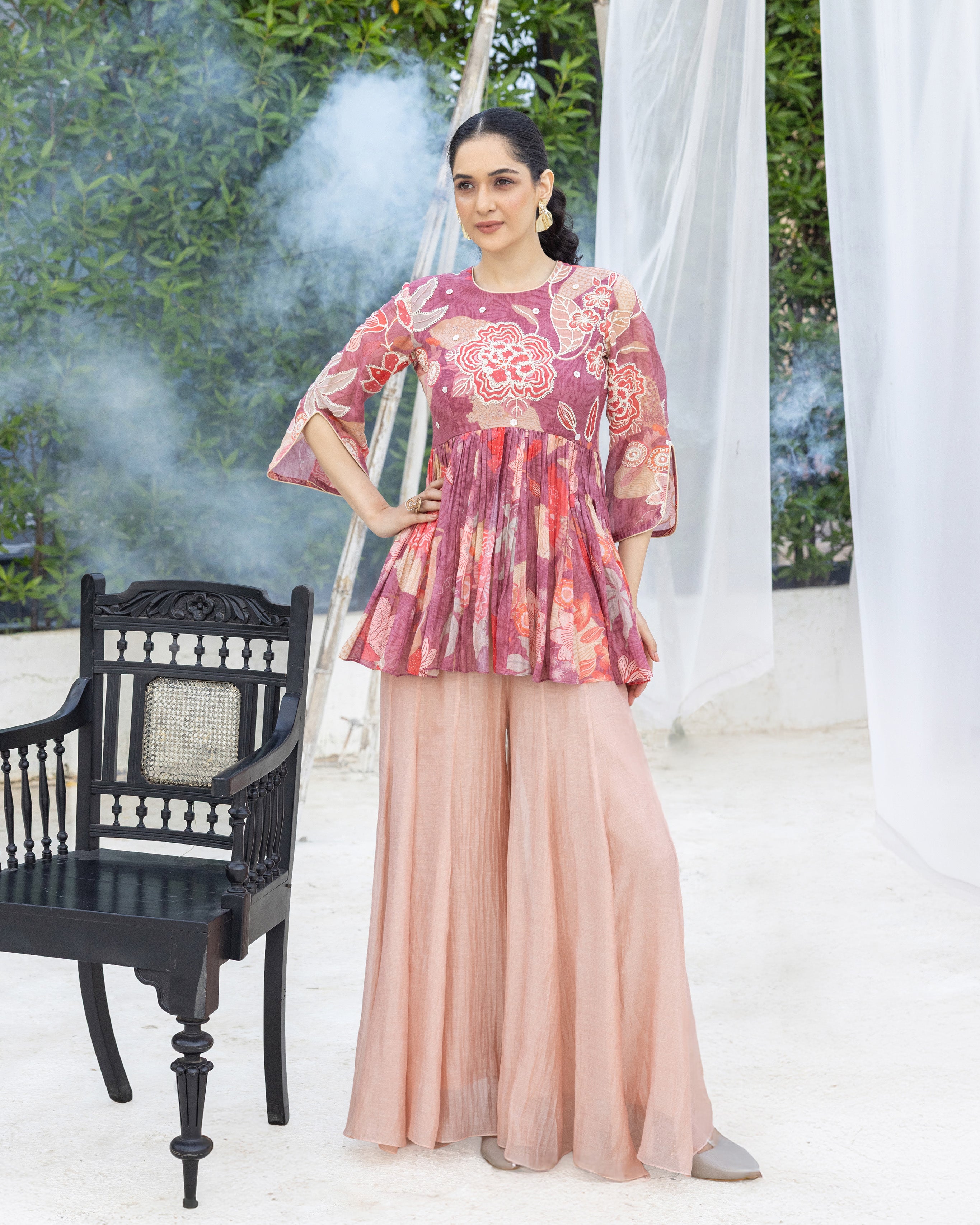 This mauve peplum and palazzo set walks the quieter path, fitted just right at the bust, flared where it counts, and grounded in soft chanderi that moves with the light. The sleeves keep it graceful, the silhouette keeps it rooted. The print feels bold yet earthy, bringing a balance of structure and ease. It’s a set that holds space for both expression and elegance.