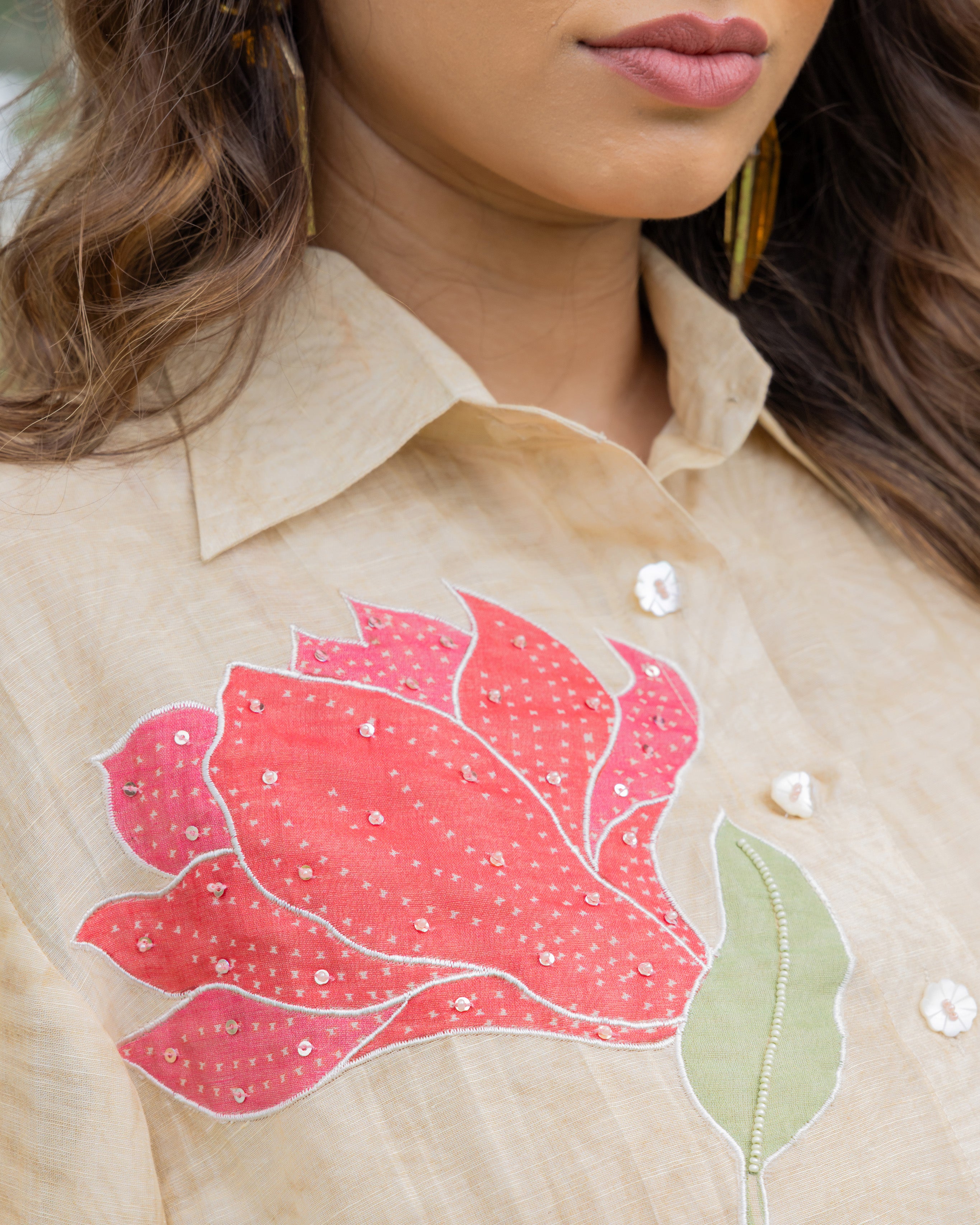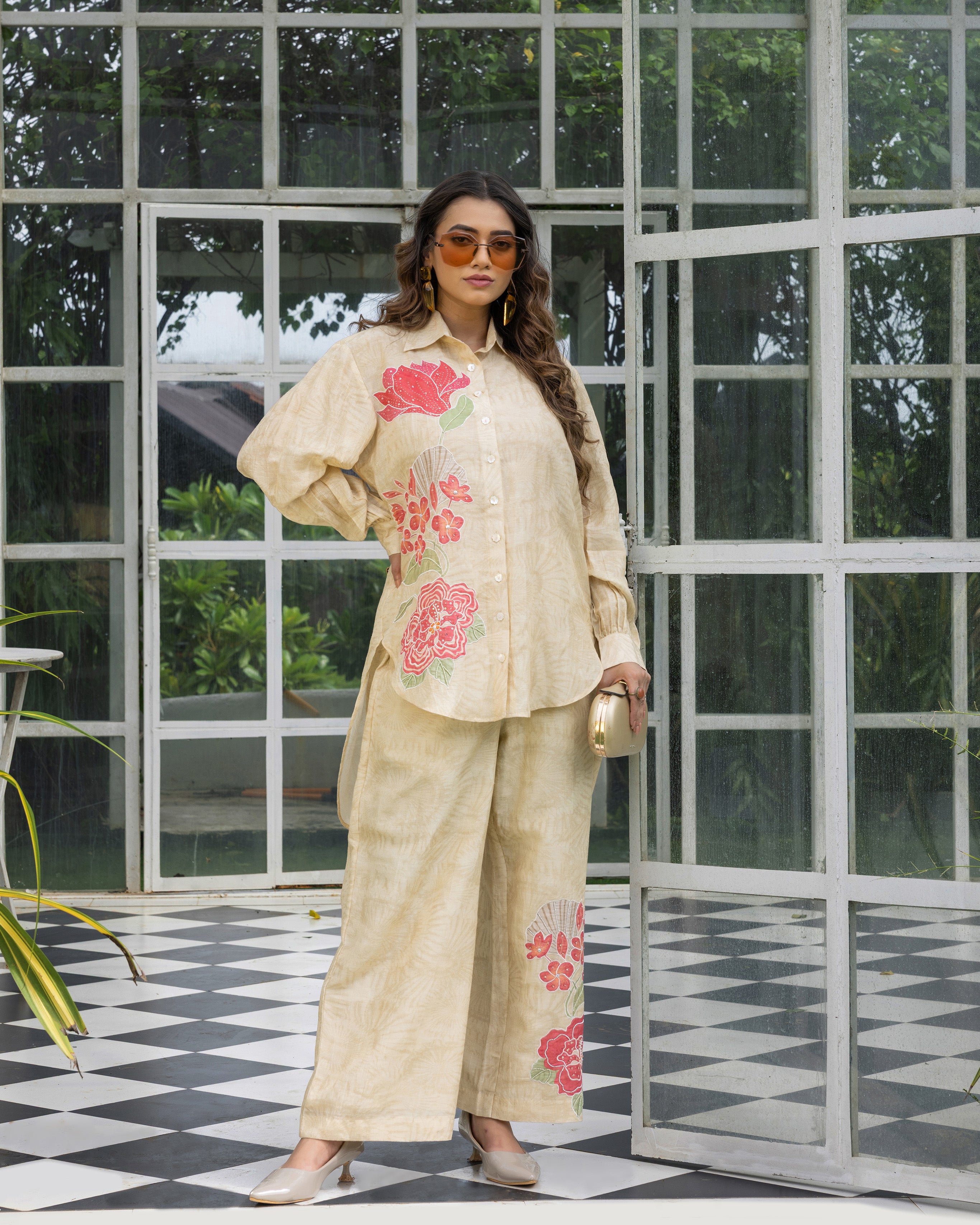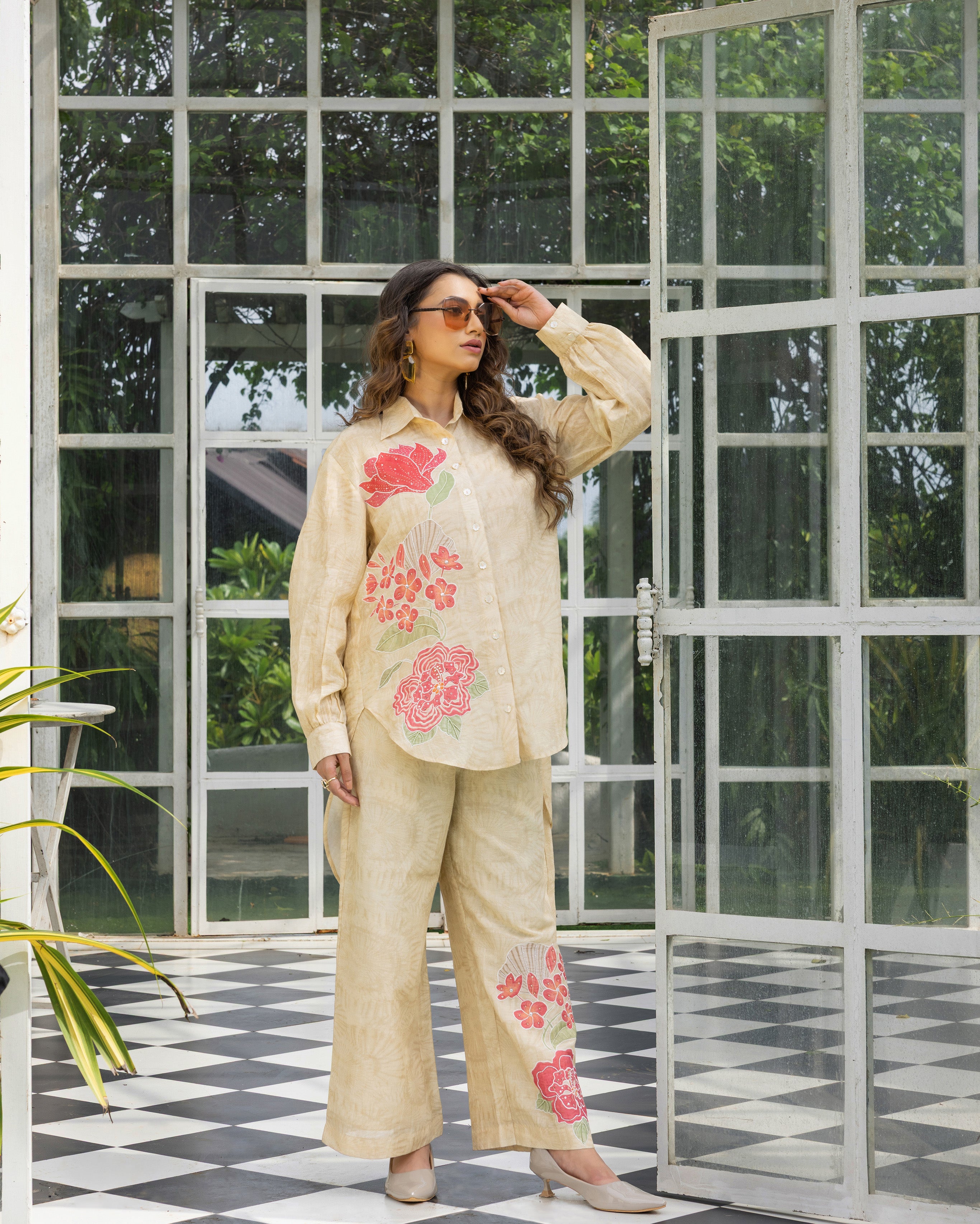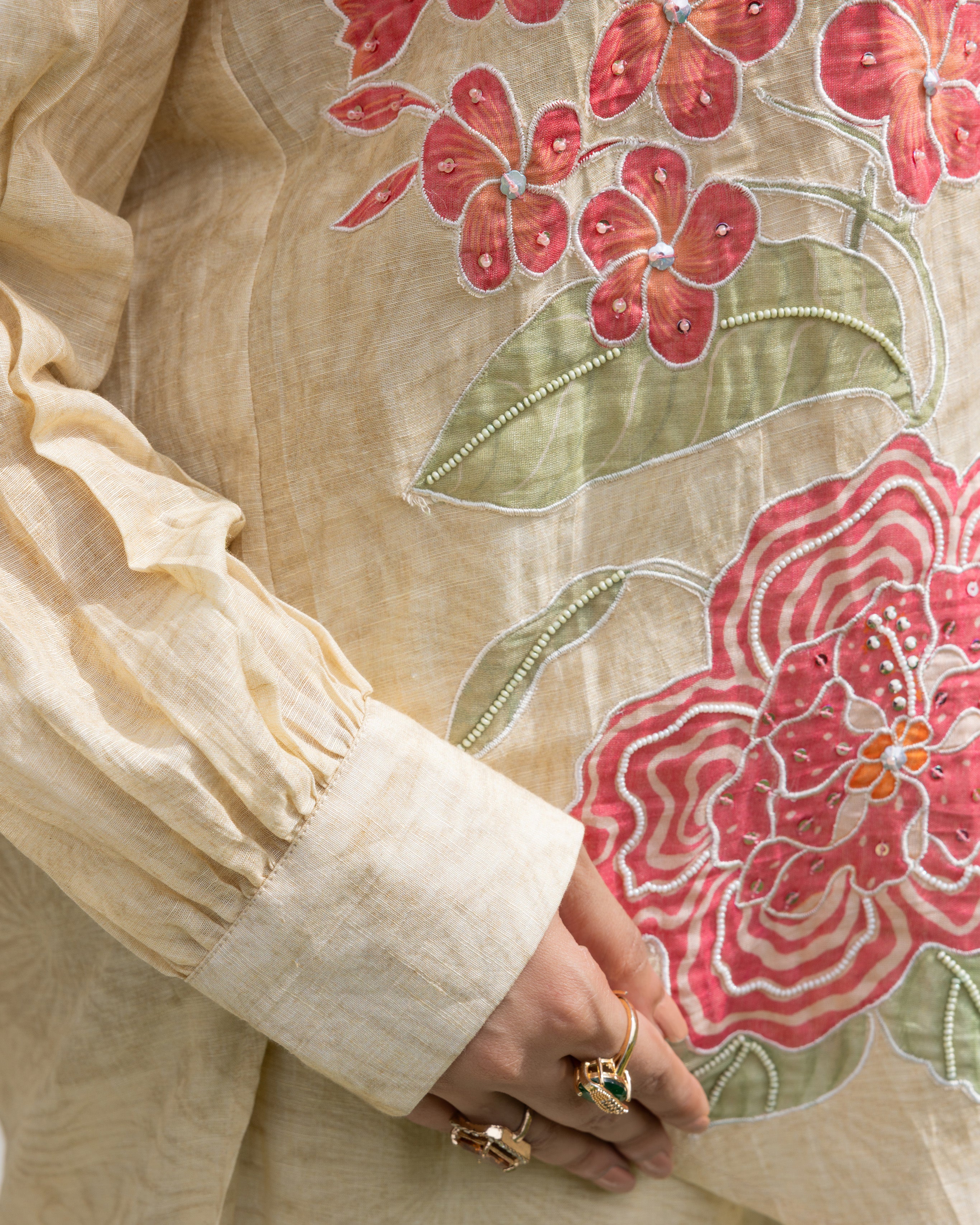 This ivory linen set is timeless in the best way. The shirt wears like a warm-weather classic, while the floral-detailed pants add a hint of colour without overdoing it. It's light, breathable, and always just right. On days when you don’t want to try too hard but still want to look like you did, this is your answer.